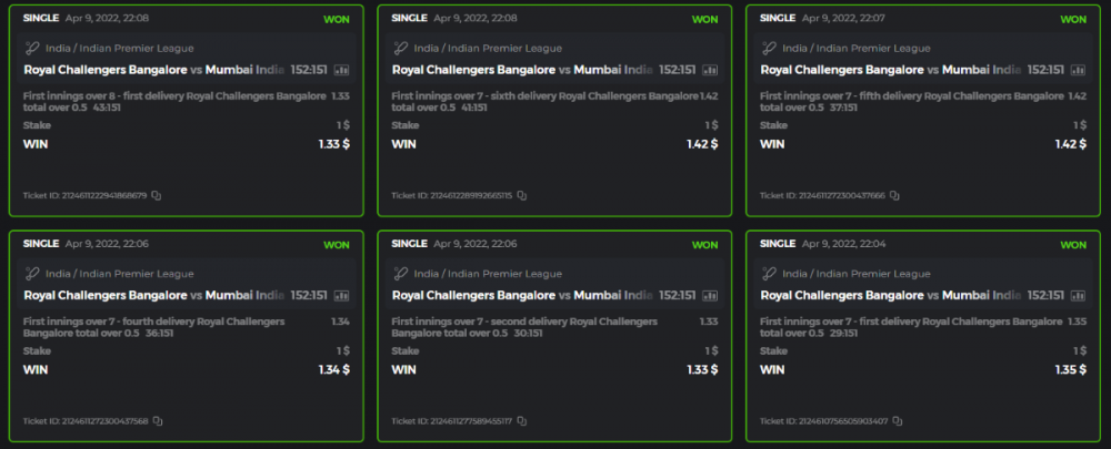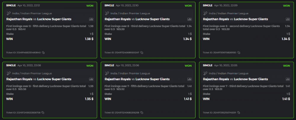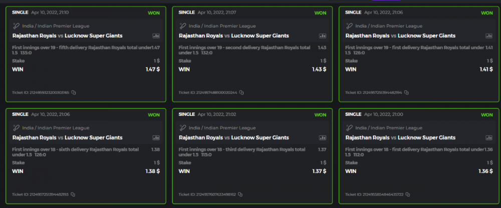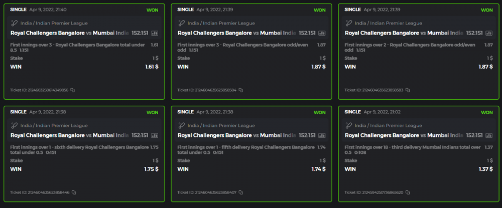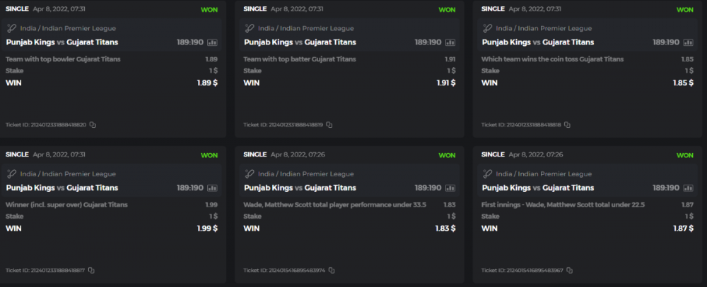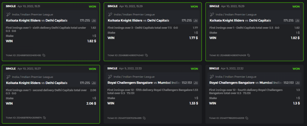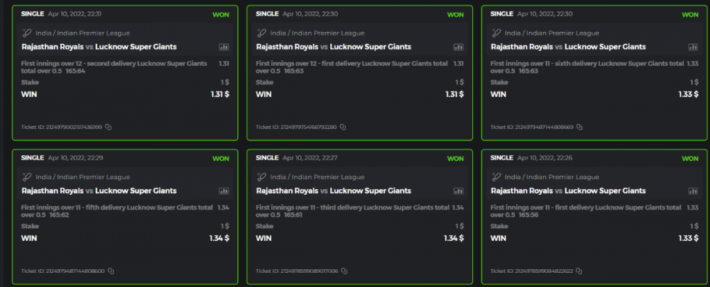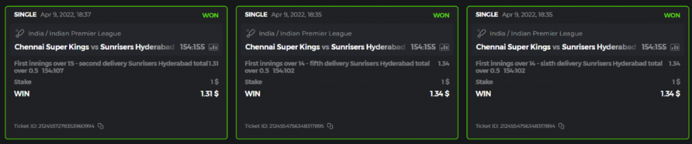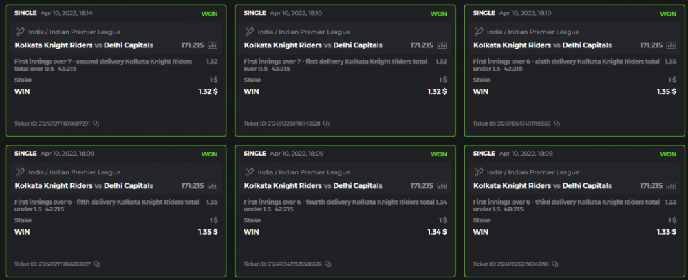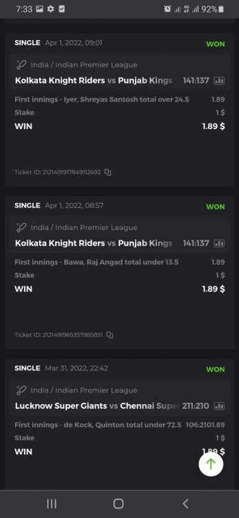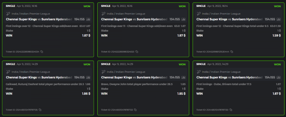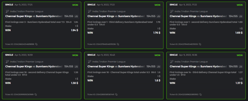 10. Well played bro but i Think your parlay combo bets are invalid because the Minimum odds pr match is 1.3 so you placed bet in combo of 4 than total odds must be atleast 2.8561 but total odds of your parlay combo bets showing 1.78 it means you have selected market lower then 1.3 in combo bet. please upload full screen shot like this of your combo bets so other competitors can see odds and can see that you have placed bets in IPl only in combo bet.. Thanks